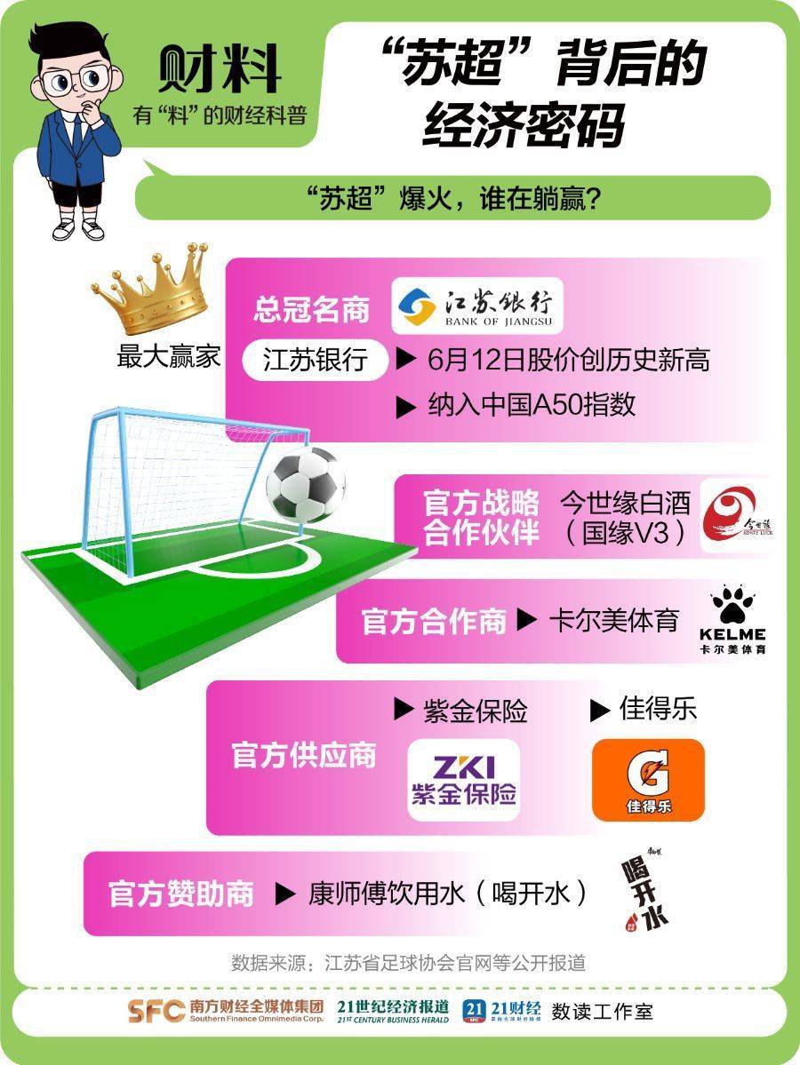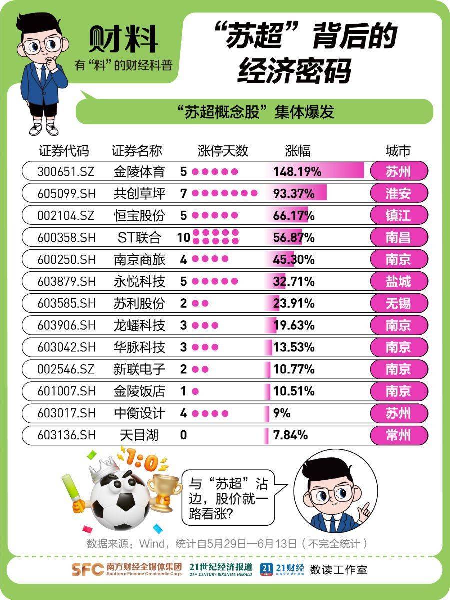 A股“苏超概念股”同样上演“进球盛宴”。《21财料》观察发现,5月29日—6月13日,ST联合(600358.SH)、共创草坪(605099.SH)、金陵体育(300651.SZ)分别涨停10天、7天、5天,其中金陵体育(300651.SZ)涨幅高达148.19%。总冠名商江苏银行更“躺赢”出圈,6月12日股价创历史新高并跻身中国A50指数。